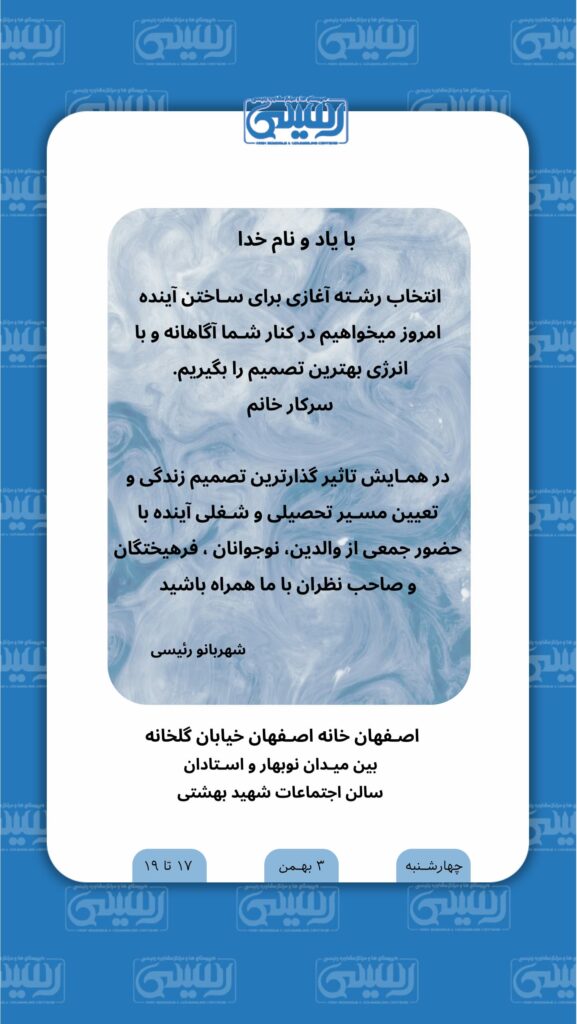 تاریخ: [3 بهمن 1403] ساعت: [17 تا 19] مکان:اصفهان خانه اصفهان خیابان گلخانه بین میدان نوبهار و استادان سالن اجتماعات شهیدبهشتی